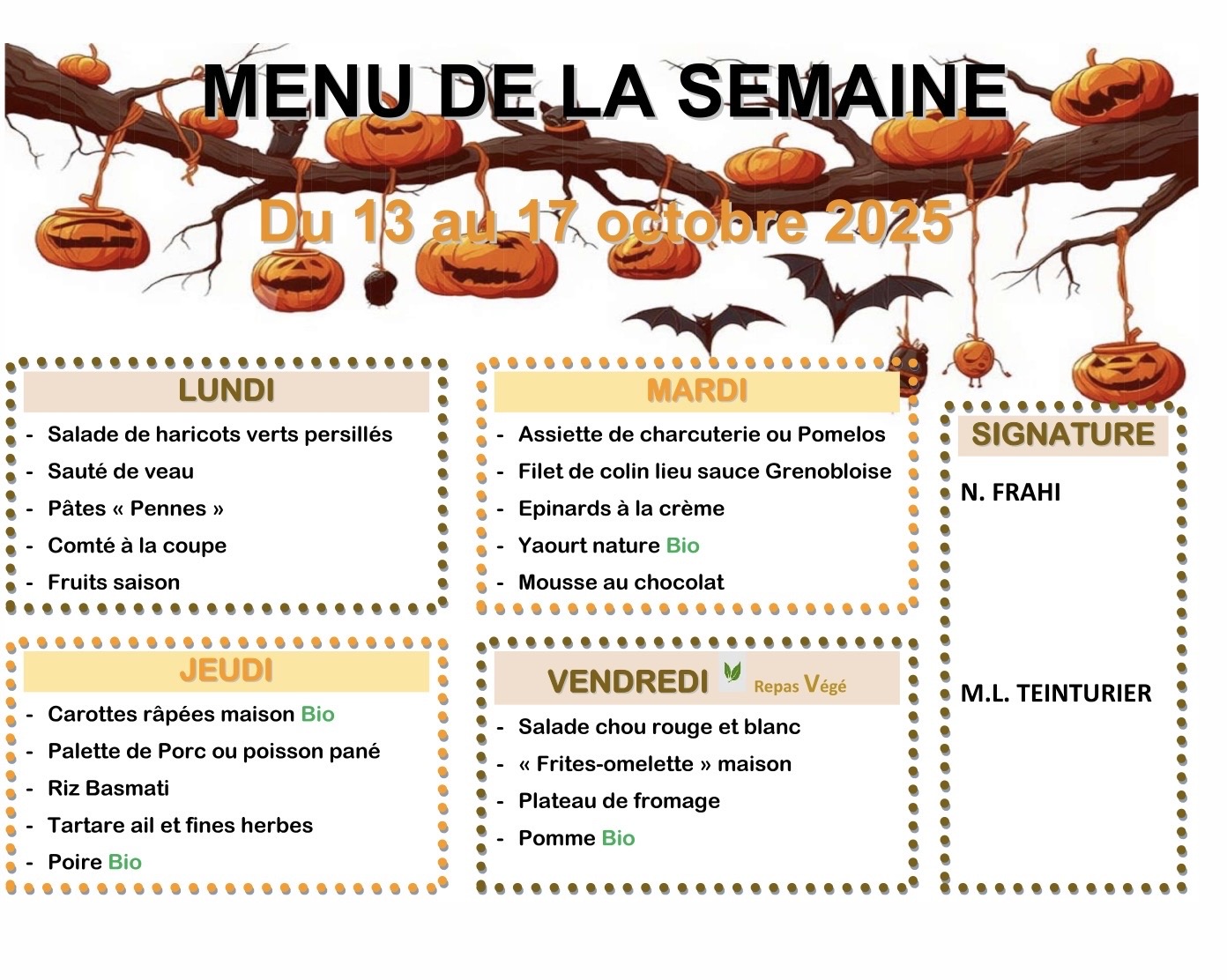 Menu du 13 octobre 2025 au 17 octobre 2025.