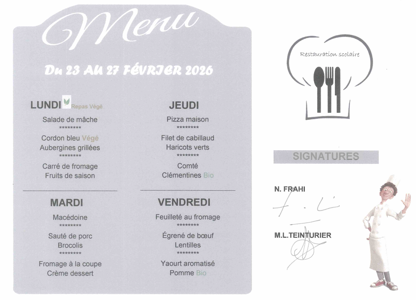 Menu du 23 février au 27 février 2026.