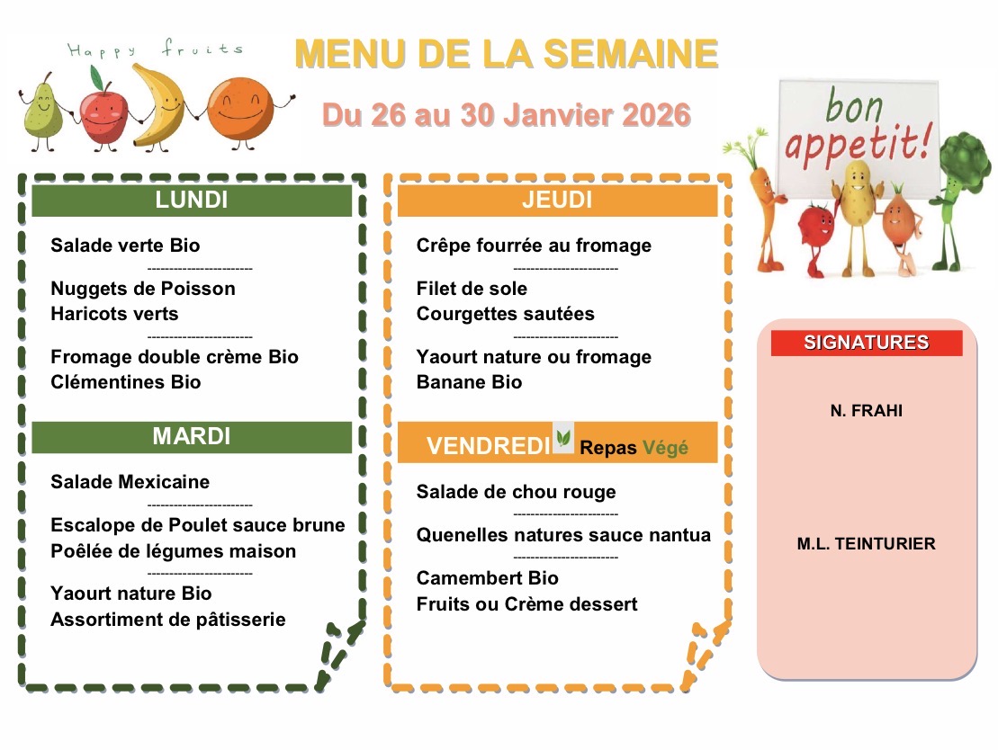 Menu du 26 janvier 2026 au 30 janvier 2026.